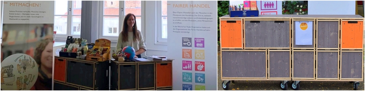 Für euren mobilen Weltladenstand könnt ihr bei uns einen rollbaren Tresen mit den Maßen 1,8 m breit, 0,7 m hoch und 0,3 m tief leihen – auch mit schicker Verkleidung im „WELTLÄDEN neu erzählen“-Design (weiß oder orange). Zur Produktpräsentation bieten wir zudem passende Displays an.